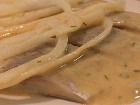 500 г сельди, 2 небольших яблока, 1 крупная луковица, 1 стакан сметаны, соль, сахар, лимонный сок по вкусу.