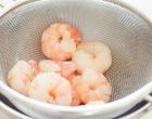 800 г креветок, 4 помидора, 1 банка зеленого горошка, 2 луковицы, 4 соленых огурца, лимон, зелень.