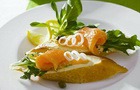 200 г копченой семги, 1 луковица, петрушка, 1 ч. л. горчицы, соль, перец черный молотый, 1 лайм, рукола, 1 багет, масло сливочное.