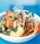 100 г филе рыбы горячего копчения, 2 огурца, 2 нектарина, соль, перец, лимонный сок, оливковое масло.