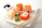 125 г риса "Японика" Мистраль, 1 лист прессованных морских водорослей (нори), 1 авокадо, лосось – 100 г, сыр "Филадельфия" - 50 г, рисовый уксус для суши, 1/4 лимона, соевый соус - по вкусу, васаби, гари.