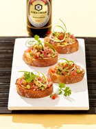 200 г свежего тунца, 1 головка зеленого лука, 1/2 авокадо, 100 г помидор черри, 1/2 необработанного лайма, 1 ч.л. пасты васаби, 4 ст.л. соевого соуса Kikkoman, 1 щепотка белого перца, 40 г масла, 8 ломтиков багета, несколько листьев кориандра.