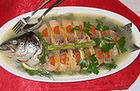 1 стерлядка, 2 кг мелкой речной рыбы, 5 морковок, 3 луковицы, 2 яйца, горсть изюма, 1 ст. л. сахара, черный перец горошком, 5-6 листиков лаврушки, соль, желатин, коренеь и зелень петрушки.