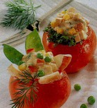 На 4 порции: 8 помидоров, 2 ст. ложки зеленого горошка глубокой заморозки, 100 г молодых стручков гороха, соль.