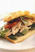 На круглый ломтик белого хлеба, намазанным маслом с горчицей, положить кусочек мяса от грудки курицы