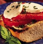 На круглый кусочек поджаренного хлеба положить полукруглый ломтик помидора и огурца.