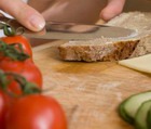 4 кусочка батона, 1 плавленый сырок, куриный или свиной паштет, 4 листа салата, 30 г сливочного масла, 3 помидора.