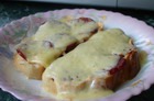 2 кусочка батона, 6-8 кружочков копченой колбасы, 2-4 тонких ломтика сыра, кетчуп, майонез.