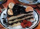 Тесто: 3 яйца, 1 стакан сахарного песка, 1 стакан "Малютки", 1 стакан муки, 1/2 ч. ложки соды, 3 ст. ложки кипящей воды.