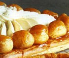 500 г сладкого заварного теста, 250 г готового слоеного теста, 50 г сахарной пудры, 600 г сметаны.