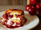 3 тонких коржа слоеного теста, 175 г сливок, 3 ст.л. сахара, 8 г желатина, 500 г консервированной вишни, 1 ст.л. крахмала.