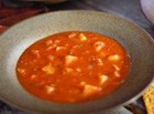 1 литр томатного сока нагреть до кипения, 300 г бекона или ветчины обжарить, 1-2 шт. репчатого лука обжарить вместе с беконом.
