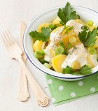300 г соленой сельди, 4 вареных картофелины, 1 репчатая луковица, 1 ст.л. растительного масла, 1 ч.л. столовой горчицы, 1 ч.л. уксуса, зелень и черный молотый перец по вкусу.