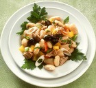 400 г консервированной фасоли, 1 банка консервированного тунца (кусочками), 2 черешка сельдерея, 1 красная луковица, оливки, зелень петрушки, лимонный сок, оливковое масло, соль и черный молотый перец по вкусу.