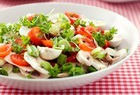 300 г шампиньонов, 300 г помидоров, 200 г вареного картофеля, 1 репчатая луковица, 3 ст.л. растительного масла.