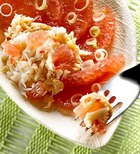 4 грейпфрута розового цвета, 3 луковицы-шалот, 50 г орешков кешью, растительное масло, немного сахара и свежих листьев мяты, горсть мелко нарезанной кинзы.