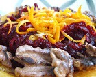 1 отварная свекла, 1 свежая морковь, 3-4 шт. чернослива, 1 зуб. чеснока, горсть грецких орехов, оливковое масло.