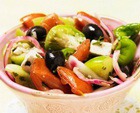 8 помидорок черри, 2 яблока, 4 моркови, 2 красных луковицы, петрушка, маслины без косточек, 1/2 лимона, 1 ч.л. сахарного песка, растительное масло, соль.