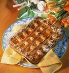 800 г мягкого творога, 1/2 стак. сахарной пудры, 1/2 стак. сахара, 2 ст.л. сливочного масла, 1 ст. сметаны (25%), 3 яйца, 1/2 ч.л. молотого мускатного ореха, 1/2 ч.л. молотой корицы, 2 ч.л. ванильного сахара, 1/2 ст. сливок (33-35%), 1 ст.л. апельсиновых цукатов, 2 ст.л. изюма, 2 ст.л. орехов.