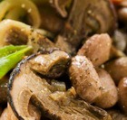 1 стак. фасоли (красной или белой), 400-500 г шампиньонов, 200-250 г тертого сыра, 1 луковица, 4 ст.л. соевого соуса, масло растительное, зелень, лавровый лист, соль.