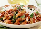 300 г цветных макарон, 50 г сливочного масла, 1 луковица, 150 г салями, 150 г свежих грибов, 1 маленький красного острого перца, 4 ст.л. сухого белого вина, 3 ст.л. лимонного сока, 6 консервированных помидоров (без кожицы), зелень, тертый сыр.