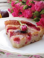 Кисленькая слива, запеченная со сладким миндальным кремом, белым шоколадом и сливками. Советую попробовать.