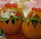 2 апельсина, 1 киви, сахарный сироп, взбитые сливки, орехи и тертый шоколад для украшения.