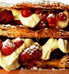 300 г слоеного теста, растительное масло для выпекания, 2 белка, щепотка сахарной пудры, 4 желтка, 500 г мягкого сыра высокой жирности, ягоды или фрукты по вкусу.