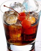 Коньяк - 50 г, апельсиновая настойка - 30 г, кусочек сахара, одна вишня, кружок лимона, лед.