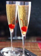 Шоколадный крем или ликер - 40 г, лимонный сок - 20 г, шампанское - 100 г, лед, 5-6 вишен...