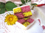 Традиционный десерт английской кухни торт "Баттенберг" выпекается из двух коржей розового и жёлтого цвета, которые прослаивают абрикосовым джемом и собирают в шахматном порядке. В классическом варианте торт покрыт марципановой глазурью. Опираясь на рецепт, проверенный временем, я приготовила мини-кексы, покрытые глазурью на основе белого шоколада.
