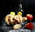 Совершенно нежные, ароматные и невесомые рогалики с фруктовой начинкой, и тонким ароматом корицы. В этот раз делала с яблоками и сливой. Очень вкусные и полезные рогалики. Сколько не съешь-много не бывает.