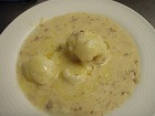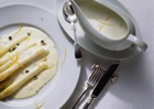2 стакана основного белого соуса, 4 желтка, 100 г сливочного масла, сахар и уксус - по вкусу.