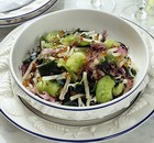 100 г свежей капусты, 150 г морской капусты, 1 небольшую луковицу, 1 небольшой огурец, 30 г растительного масла, сахар и соль по вкусу.