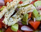 250 г сладкого перца, 200 г огурцов, 200 г помидоров, 2 репчатые луковицы, 150 г брынзы, 10 г зелени укропа, 10 г зелени петрушки, 10 г зелени базилика, растительное масло, соль, перец, лимонный сок по вкусу.