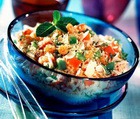 1 баклажан, 1 кабачок, 2 сладких перца, 2 луковицы, 3 ч.л. растительного масла, 2 ч.л. лимонного сока, 100 г сыра фета (брынзы), 1 стак. вареного кускуса (булгура), 1 ч.л. соли, 1 ч.л. тимьяна, черный молотый перец.