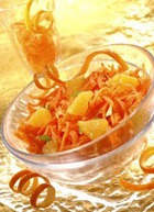 200 г зернистого творога, 1 апельсин, 1 морковь, 2 ст.л. изюма, черный молотый перец, орегано.
