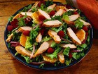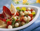 250 г куриного филе, 200 г малины, листья салата, зеленый лук, 50 г твердого сыра, 4 ст.л. растительного масла, 4 ч.л. винного уксуса, 4 ч.л. зерненого творога, соль, перец, сахар по вкусу.