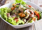 200 г ветчины из индейки, 400 г консервированной кукурузы, 500 г мякоти арбуза, 1 огурец, листья салата, 3 ст.л. неострой горчицы, 2 ст.л. растительного масла, зеленый лук, соль, перец, сахар, винный уксус.
