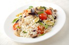 рис "Индика голд" Мистраль — 2/3 стак., грибы – 100-150 г, помидоры черри – 100-150 г, чеснок – 3 зуб., цукини – 1 (небольшой), растительное масло — несколько столовых ложек, соль, специи, зелень для украшения — по вкусу.