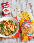 250 г Пенне Divella Parmalat, 2 сладких помидора, 1 баклажан, 1 патиссон, 1 белый лук, 2 болгарских перца, 5 ст.л. оливкового масла, горсть шпината для украшения.