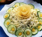 Витлуф и свежий огурец тщательно промыть холодной водой и нашинковать соломкой.