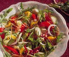 На 1 стакан вареного риса – 6-7 стручков красного перца, 1 стакан вареного зеленого горошка, по 2 ст. л. уксуса и растительного масла, 1 яйцо, соль и сахар по вкусу.