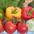 На 1 литровую банку: 2-3 огурца, 5-7 шт. помидоров, 6 зерен перца-горошка, 1/2 стакана уксусу, 2 зубца чеснока, 6-7 стручков перца сладкого красного, 2 веточки укропа, 1 ст. ложка соли, 1 стакан воды. Литровые банки хорошо промыть и прокипятить в течение 5-6 минут, затем вынуть и охладить на доске. Свежие огурцы, помидоры, красный болгарский перец хорошо промыть. Помидоры и красный болгарский перец разрезать на 4 части, из перца удалить семена, а огурцы нарезать кружочками толщиной в 2 пальца. На дно банки уложить веточку укропа, зубец чеснока, 2 зерна горького перца, сверху огурцы, помидоры и перец, затем опять специи, на специи огурцы, помидоры и перец. В отдельную посуду влить стакан горячей воды, добавить ложку соли, полстакана столового уксуса, довести до кипения, залить этим маринадом помидоры, огурцы и перец. Банку накрыть крышкой, поместив в кастрюлю с горячей водой, и при тихом кипении кипятить 20-25 минут, затем вынуть из воды; протереть горлышко, закатать.