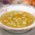 4 стакана мясного бульона 1 пучок петрушки и укропа 1/2 стакана манной крупы 1 яйцо соль, перец, молотый мускатный орех - по вкусу 1 стакан бульона разогреть, всыпать манную крупу, добавить яйцо (аккуратно, чтобы не сварилось) и тщательно размешать. Добавить специи. Полученную массу выложить в плоскую форму и выпекать 3 минуты в микроволной печи при полной мощности, не закрывая крышкой. Затем перевернуть, накрыть крышкой и в течение 4 минут довести до готовности. Полученное тесто разделить чайной ложкой или разрезать на маленькие кусочки, положить в оставшийся горячий мясной бульон и посыпать зеленью. Для микроволновки мощностью 600-650 Вт.