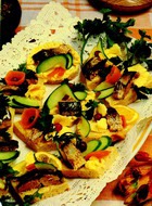 консервы "Сардина в масле" - 1/2 банки хлеб пшеничный - 8 кусочков масло сливочное - 3 ст. ложки свежие помидоры, огурцы, редис, сладкий перец, лимон маринованные огурцы - 8 кусочков или ломтиков веточки свежей зелени петрушки, укропа листочки свежего салата Соединить размягченное сливочное масло с маслом из консервов в соотношении 4:1, добавив несколько капель сока лимона. Кусочки пшеничного хлеба различной формы (ромбы, квадраты, кружочки) намазать полученной масляной смесью, сверху уложить кусочки сардин, украсить салатом, петрушкой, укропом, ломтиками помидора, огурца, сладкого перца, редиса.
