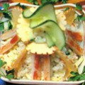 крабовые палочки - 1 пачка (100 г) огурец свежий - 1 шт. рис отварной рассыпчатый - 1/2 стакана яблоко свежее - 1 шт. майонез - 2 ст. ложки сметана - 2 ст. ложки зелень - 4 веточки соль по вкусу Крабовые палочки, свежие огурцы и яблоки с удаленным семенным гнездом нарезать соломкой, соединить с отварным рассыпчатым рисом, заправить майонезом и сметаной, выложить в салатник и украсить свежей зеленью.