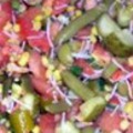 капуста морская - 2 части капуста квашеная - 1 часть картофель - 250 г свекла - 1 крупный корнеплод морковь - 1-2 шт. соленые огурцы - 1-2 шт. лук репчатый - 1-2 мелкие луковицы горошек зеленый - 100-150 г масло растительное или майонез Мелко нарезать отварные свеклу, морковь, картофель, соленый или маринованный огурец. Добавить квашеную капусту и консервированную морскую капусту, нарезанный полукольцами репчатый лук, зеленый горошек. Заправить маслом растительным или майонезом.