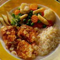4 куска филе куриной грудки 2 яйца 75 г кукурузных хлопьев 75 г миндальных листочков 3 ст. ложки растительного масла 200 мл куриного бульона 125 мл белого вина 50 г сливочного масла 1 упаковка овощной смеси 1 груша 50 г мяса крабов соль, перец, порошок паприки Разделить каждую порцию филе на 4 кусочка. Яйца взболтать с солью, перцем и паприкой. Измельчить кукурузные хлопья. Смешать с миндальными листочками. Обвалять мясо в яйце, миндале и кукурузных хлопьях. Обжарить в растительном масле. Вскипятить бульон с вином. Помешивая, ввести сливочное масло. 10 мин. тушить в нем овощи и нарезанную кубиками грушу. Вынуть из соуса овощи и грушу. Положить в соус мясо крабов и довести его до готовности. Разложить по тарелкам вместе с овощами и кусочками мяса. Хорошо подавать с рисом.