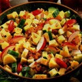 750 г картофеля 2 луковицы 125 мл мясного бульона из кубиков 250 г огурцов 2 красных яблока 200 г сыра 1 пучок редиски 4-5 ст. ложек винного уксуса 200 г бекона 3 ст. ложки семян подсолнуха 1 ч. ложка тмина, соль, перец Картофель, не очищая, сварить в подсоленной воде с тмином. Лук очистить и нарезать. Залить его горячим бульоном. Очищенный картофель нарезать ломтиками, добавить к бульону. Огурец помыть, разрезать вдоль пополам. Яблоки помыть, разрезать на 4 части, удалить сердцевину. Огурец, яблоки и сыр нарезать кубиками. Редиску почистить, помыть, нарезать ломтиками. Смешать все с картофелем. Посолить, поперчить, добавить уксус. Бекон нарезать кубиками, обжарить до золотистой корочки и положить в салат. Посыпать обжаренными подсолнечными семечками.